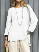 Gemaakt van 100% ademend linnen van hoge kwaliteit, waardoor je je ook bij stijgende temperaturen comfortabel en fris voelt. De rechte pasvorm valt mooi losjes, zonder vorm te verliezen. De 3/4-mouwen geven de blouse een elegante uitstraling, terwijl de iets langere lengte aan de achterkant zorgt voor een moderne, flatterende lijn. Combineer met een linnen broek of rok voor een moeiteloos stijlvolle look. Perfect voor een zomerse dag op kantoor, een lunchafspraak, vakantie of een etentje op het terras, deze blouse past zich moeiteloos aan jouw moment aan.