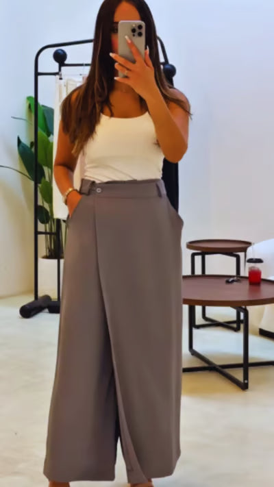 De Bianca Wijde Overslag Broek is een echte must-have voor iedere garderobe. De wijde pasvorm geeft een elegante en slanke look, terwijl de overslag aan de voorkant zorgt voor een modern en stijlvol detail. De broek is gemaakt van een luchtige, soepele stof die heerlijk zit en mooi in model blijft. Dankzij de comfortabele tailleband geniet je de hele dag van draagcomfort en de handige steekzakken maken het extra praktisch. Deze broek combineer je moeiteloos: draag hem met een blouse en hakken voor een chique uitstraling, of met een simpele top en sneakers voor een casual look. Een veelzijdig item dat je keer op keer uit de kast pakt!