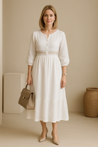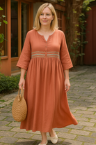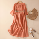 Of je nu een dagje uit gaat, een lunch met vriendinnen hebt of gewoon stijlvol de dag door wilt, de Janice Maxi Linnen Jurk is een absolute musthave. Gemaakt van 100% ademend linnen, voelt deze jurk heerlijk licht aan en houdt hij je koel op warme dagen. De losvallende pasvorm zorgt voor een moeiteloos elegante look, terwijl de knoop op de borst een subtiele, vrouwelijke touch toevoegt. De 3/4-mouwen maken de jurk extra veelzijdig – perfect voor zowel een casual als geklede uitstraling.