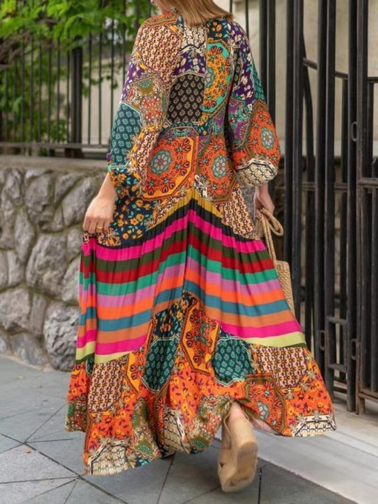 Met de Luna Retro Maxi Jurk steel je moeiteloos de show. De rijke mix van kleuren en patronen geeft deze jurk een uitgesproken karakter, terwijl de luchtige stof zorgt voor een heerlijk draaggevoel op warme dagen. De losse pasvorm, V-hals en soepelvallende mouwen maken de jurk comfortabel én stijlvol. Of je nu een zomerse dag in de stad hebt gepland, op vakantie bent of een diner buiten de deur hebt – deze jurk past zich moeiteloos aan. Een vleugje bohemian, een flinke dosis flair en eindeloze combinatiemogelijkheden: van slippers tot hakken, van tas tot statement oorbellen, jij bepaalt de look!