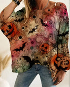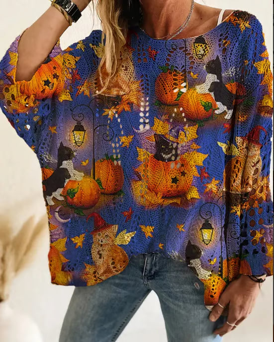 De Janna Pumpkin Sweater laat je volop genieten van het najaar. Het speelse patroon met pompoenen, vleermuizen en subtiele details geeft een knipoog naar Halloween, terwijl de stijlvolle pasvorm en zachte knit hem perfect maken voor elke dag. Deze trui combineert warmte, comfort en een unieke uitstraling – ideaal voor gezellige dagen thuis, een herfstwandeling of een avondje uit.