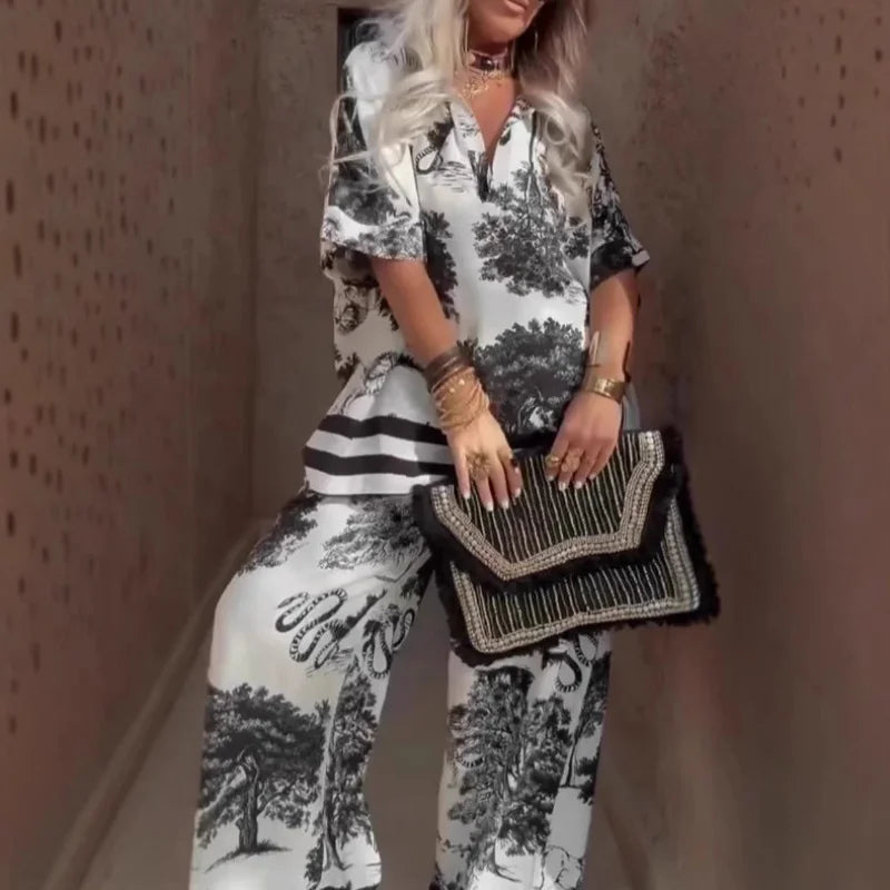 Soms wil je gewoon een outfit die áltijd goed zit. De Sarah Co-ord Set is precies dat: stijlvol, trendy en tijdloos! De set heeft een relaxte pasvorm en bestaat uit een blouse en bijpassende broek in een prachtig uniek en zomers design. Samen vormen ze een moeiteloze look die perfect is voor een koffiedate, een etentje of op vakantie. De stof voelt zacht aan en biedt ultiem draagcomfort. Een absolute musthave die niet mag ontbreken in je garderobe.